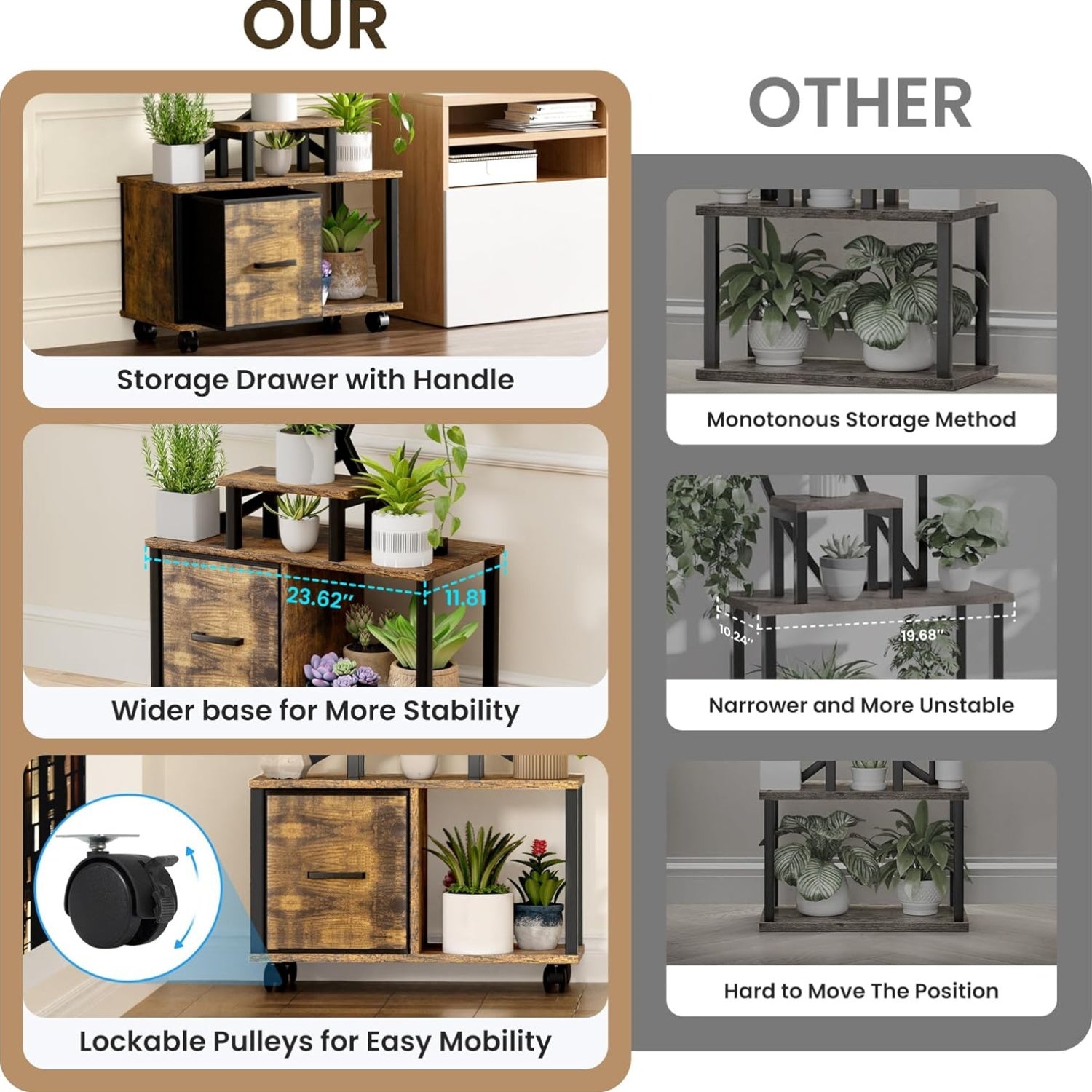 - Lockable, smooth casters let you move the stand with ease and then secure it in place for steady growth and tidy arrangement.