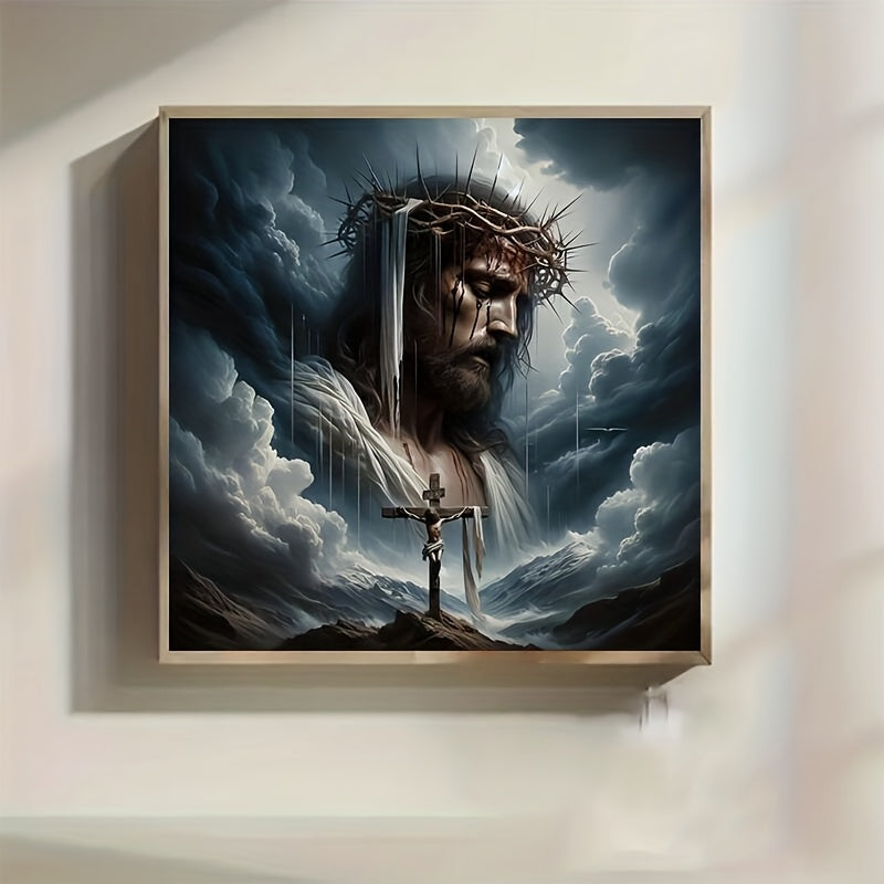 Immerse yourself in a luminous moment of faith with the 5D Diamond Painting Kit Christ Crucifixion And Resurrection Wall Art.