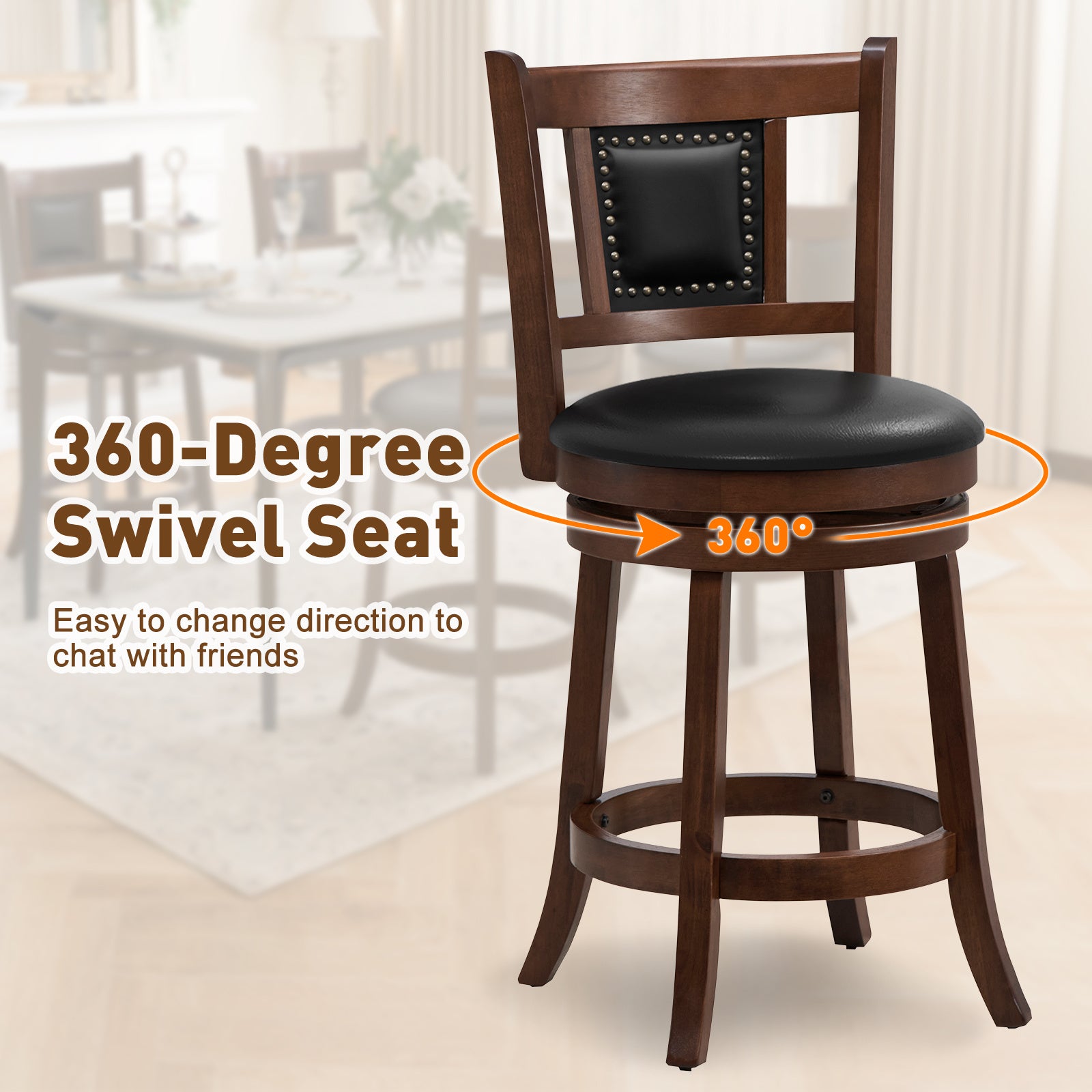 - 360° swivel padded seat lets you rotate freely to chat with guests and reach items at the counter, ideal for casual dining or socializing.