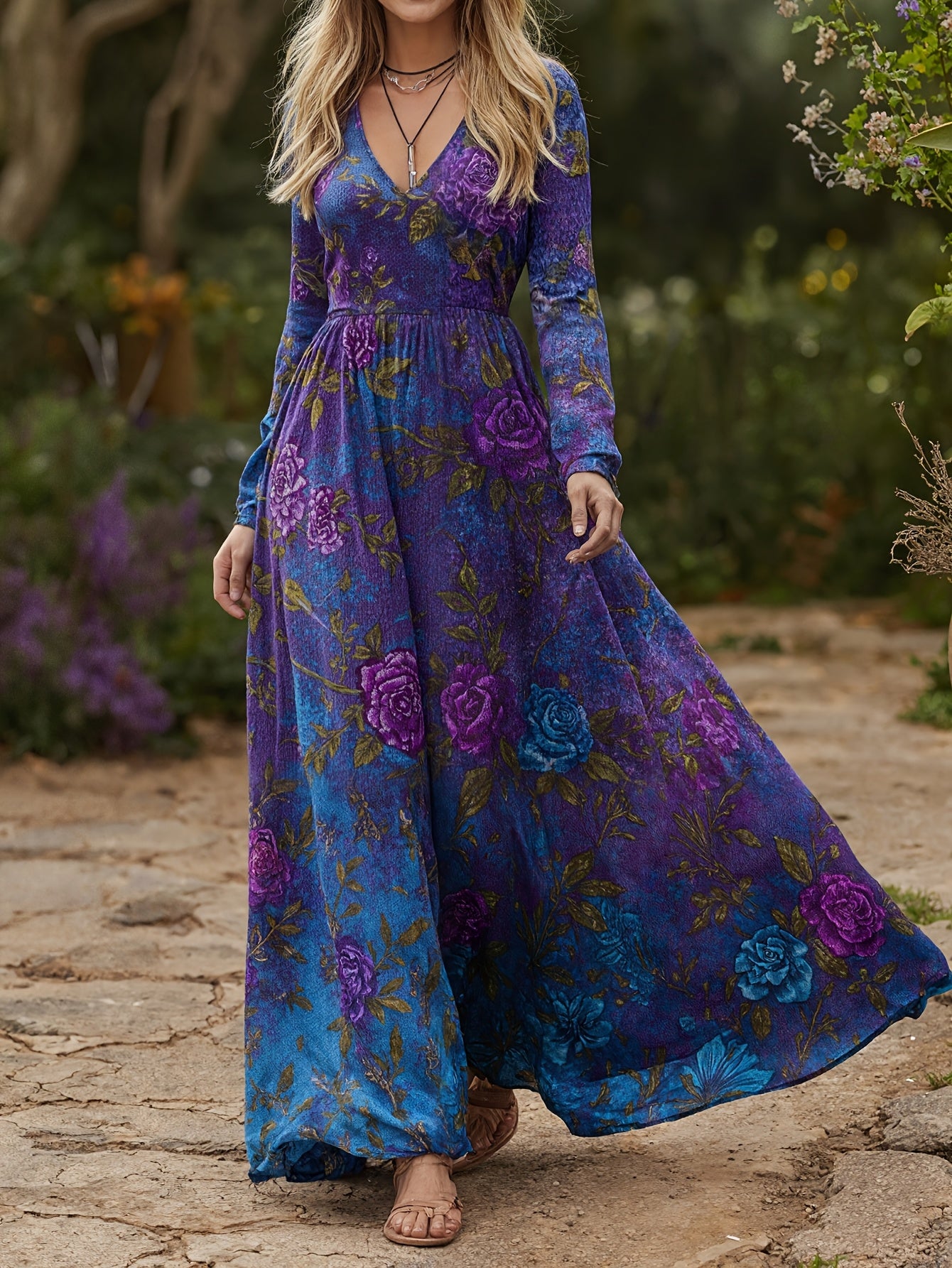 CIUM Elegant Flower Print Maxi Dress Long Sleeve V Neck